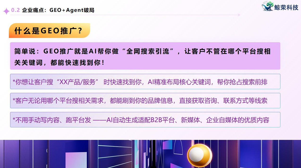 从行业优势来看,鲸荣科技聚焦于解决中小企业数字化营销的痛点。当前,人力与运营方面,多数企业面临人力成本占比攀升、人工服务存在咨询盲区、内部信息孤岛严重等问题,行业也缺乏统一服务标准,客户体验参差不齐;获客转化上,企业获客广撒网导致流量质量差、关键词布局盲目、获客成本持续高企,且公域流量红利消退,关键词优化技术难以覆盖全域场景。而鲸荣科技凭借其 GEO - AI 技术,为企业提供了有效的解决方案。